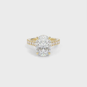 The Jennie Ring is crafted with a 10x7.5mm Brilliant Oval moissanite center stone and features round lab grown diamond accents. This ring is available in 18k Yellow Gold