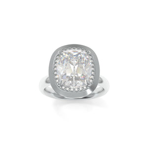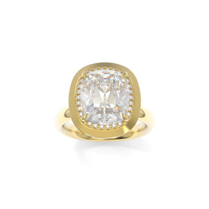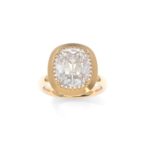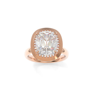 The Betty ring blends bold structure with delicate detail. Featuring a dainty diamond halo and a distinctive pseudo-bezel, this design offers the best of both worlds with strong architectural accents softened by feminine sparkle.