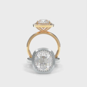 The elevated center diamond, secured in minimalistic prongs, adds height and presence while the non-functional bezel brings a striking contrast to the halo’s feminine elegance.