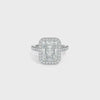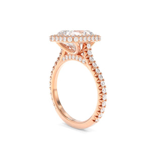 The intricacy continues with a signature “waterfall” halo, where diamonds cascade gracefully around the contour of the setting, illuminating the through-finger view. Completing this sophisticated silhouette is a French-set diamond shank—an old-world technique rarely seen today, executed with precision and reverence for traditional craftsmanship.