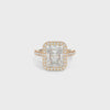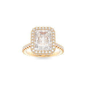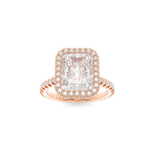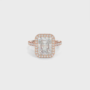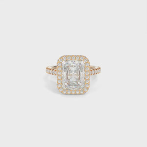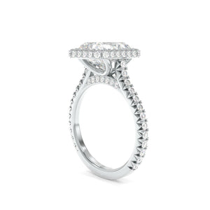 The Dakota Ring is a masterclass in elevated design and artisan detail. At its heart, a multitude of micro-prongs secures the center stone while simultaneously embracing the surrounding halo, creating the illusion of a seamless, prong-less setting that allows the center diamond to shine with uninterrupted brilliance.