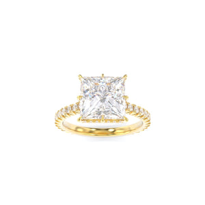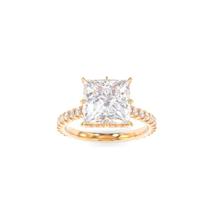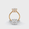 The model image depicts The LynnieBeth Ring featuring a 5.01ct F VS1 Cross-Faceted Radiant lab grown diamond center stone, styled with the LynnieBeth Ring (JL Version) featuring a 3.07ct F VS Heart Lab Grown Diamond and the Bezel Set Solitaire Heart.