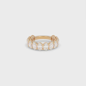 The Maya Oval Band is an iconic design that seamlessly marries personal style with a declaration of devotion. Featuring 2.65ctw of 4.5x3mm oval lab grown diamonds set in recycled 18k Champagne, this piece embodies timeless sophistication with a bold, refined brilliance.