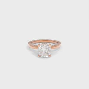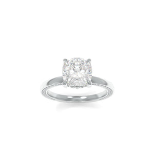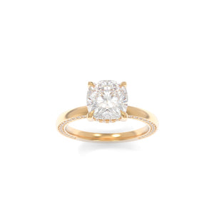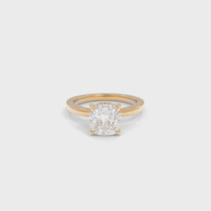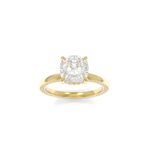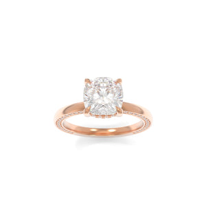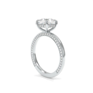 The Olivia Ring is a study in contrast- understated from one angle, unexpectedly dazzling from another. What appears to be a classic solitaire reveals its true character in the details: a hidden diamond halo softly illuminates the center stone, while additional diamonds are artfully set in the through-finger view on both sides, creating a unique and unexpected sparkle.