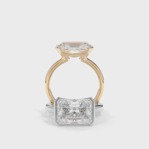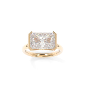 The Perry is a thoughtfully engineered partial bezel design featuring an east-west center stone orientation, enhanced by a sculpted support bar that traces the facet junctions of the center diamond, providing both protection and aesthetic refinement.
