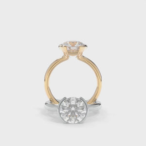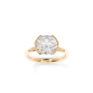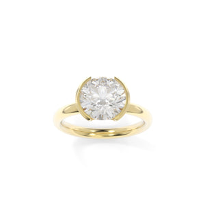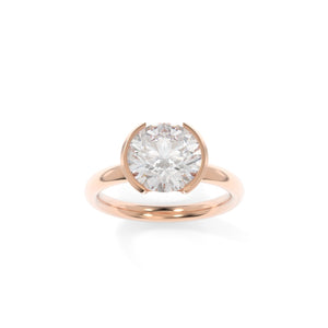 The Perry is a thoughtfully engineered partial bezel design featuring an east-west center stone orientation, enhanced by a sculpted support bar that traces the facet junctions of the center diamond, providing both protection and aesthetic refinement.