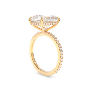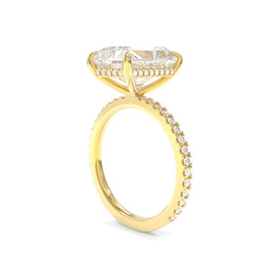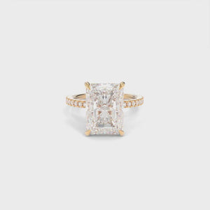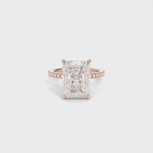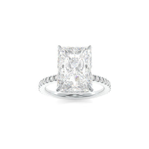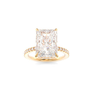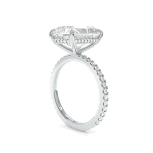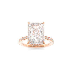 The Taylor Ring is crafted with your selection of a moissanite or a lab grown diamond center stone and features round lab grown diamond accents. This ring is available in your choice of 18k gold or platinum.