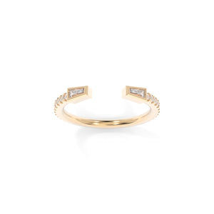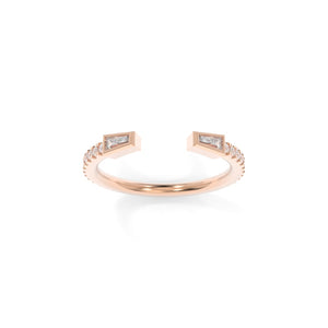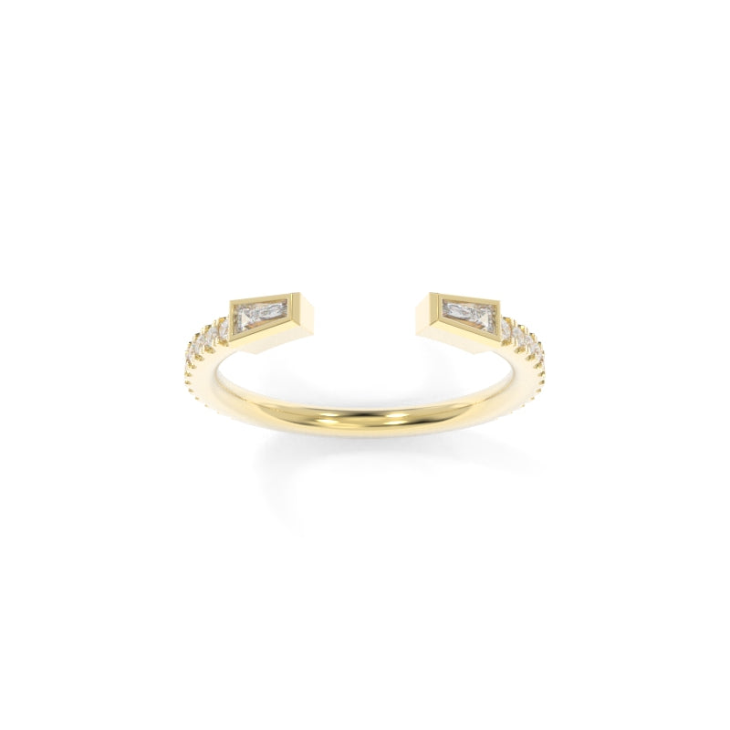 The London Band is the perfect companion for a low-profile basket engagement ring, designed to hug it closely for a seamless fit. This open-band design allows you to effortlessly stack it with other pieces or let the two stand alone as a chic duo. Featuring a stunning combination of twinkling scallop-set round diamonds and bezel-set tapered baguettes, the London Band brings a unique twist to your stack while maintaining elegance and versatility. Whether worn alone or paired with your engagement ring, this band adds a modern, sophisticated touch to your jewelry collection.