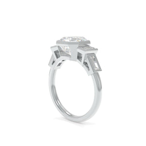 The Clara Ring is crafted with an 8mm asscher moissanite center stone, baguette moissanite side stones, and is available in 18K White Gold.