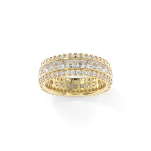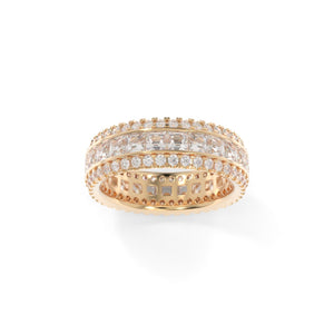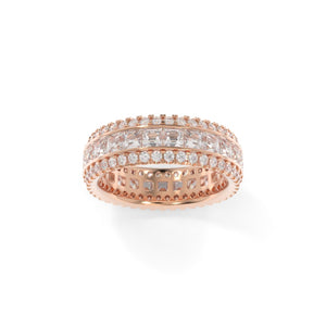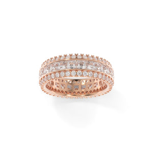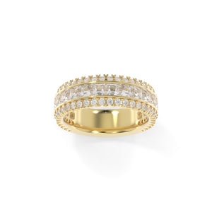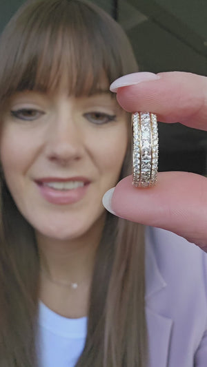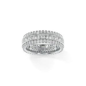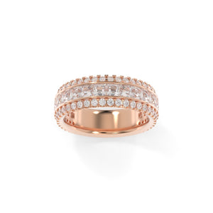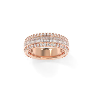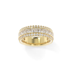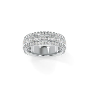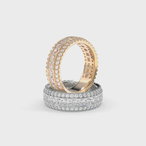 The Anastasia features a center row of french cut diamond contrasted by a row of round brilliant diamonds on either side. This statement band can be worn alone or stacked with other designs. Anastastia can also be ordered with french-set round diamonds for an elevated version of the design.