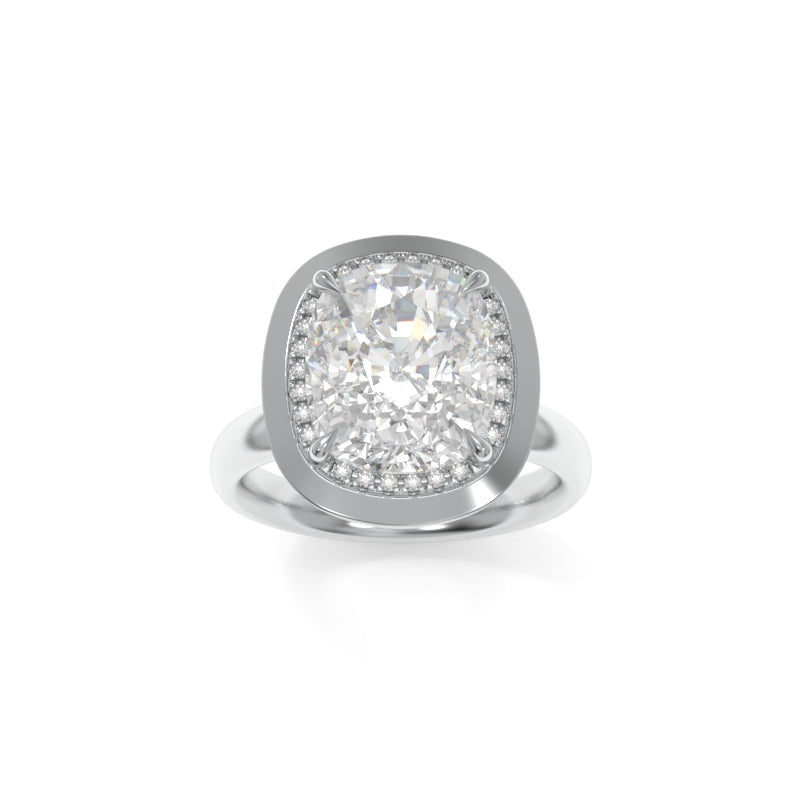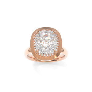 The Betty ring blends bold structure with delicate detail. Featuring a dainty diamond halo and a distinctive pseudo-bezel, this design offers the best of both worlds with strong architectural accents softened by feminine sparkle.
