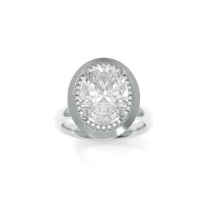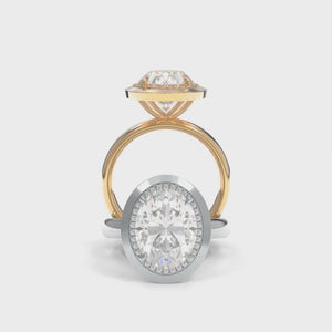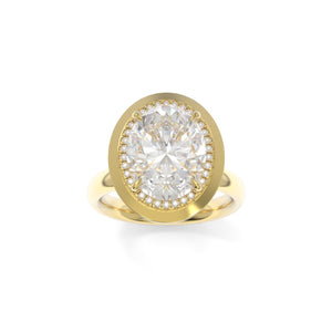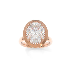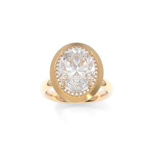 The Betty ring blends bold structure with delicate detail. Featuring a dainty diamond halo and a distinctive pseudo-bezel, this design offers the best of both worlds with strong architectural accents softened by feminine sparkle.