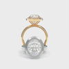 The elevated center diamond, secured in minimalistic prongs, adds height and presence while the non-functional bezel brings a striking contrast to the halo’s feminine elegance.