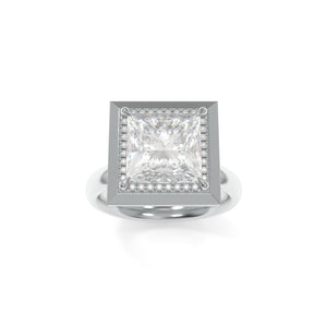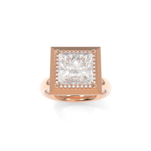 The Betty ring blends bold structure with delicate detail. Featuring a dainty diamond halo and a distinctive pseudo-bezel, this design offers the best of both worlds with strong architectural accents softened by feminine sparkle.