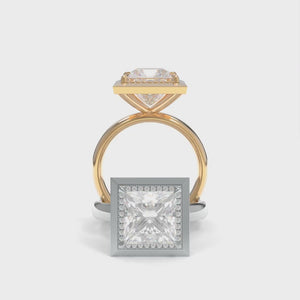 The elevated center diamond, secured in minimalistic prongs, adds height and presence while the non-functional bezel brings a striking contrast to the halo’s feminine elegance.