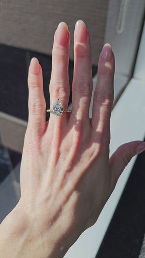 This Camilla Solitiaire features a 3.52ct F VS1 Pear Shape Lab Grown Diamond in recycled platinum & 18k Yellow Gold.