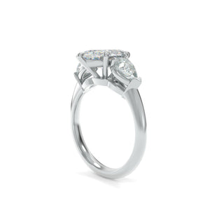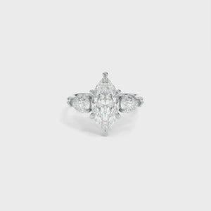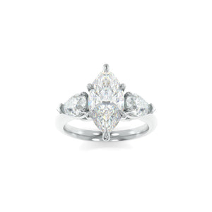 This Charlotte Solitaire is crafted with a 12x6mm Marquise TTG Moissanitecenter stone with pear moissanite side stones set in 18K Champagne Gold.