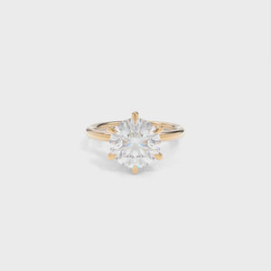 This Jennie Solitaire is crafted with an 8.5mm Round H&A TrueGem Moissanite center stone set in 18K Champagne Gold.