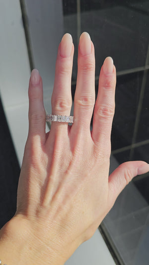 The Maya Radiant Band is an iconic design that seamlessly marries personal style with a declaration of devotion. Featuring 5.00ctw of 5x3mm Radiant Cut Lab Grown Diamonds set in recycled Platinum, this piece embodies timeless sophistication with a bold, refined brilliance.