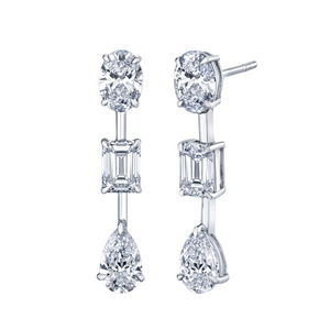 A harmonious blend of elegance and versatility, our Mixed Diamond Drop Earrings are a celebration of timeless design. Featuring a playful combination of oval, emerald-cut, and pear-shaped diamonds, these earrings are masterfully balanced and scaled to suit any occasion.