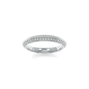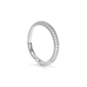 The Octavia Band features a knife edge shank with milgrain and bead and bright detailing with round lab grown diamonds and is available in 18K White Gold.
