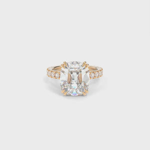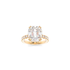 The Rachel Ring is crafted with a 9.5x8mm Old Mine Cushion moissanite center stone, lab grown diamond accents, and is available in 18K Champagne Gold.
