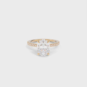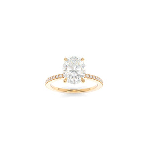 The Tara Ring is crafted with a 10.5x8mm Modern Ovalmoissanite and features round lab grown diamond accents. This ring is available in 18K Champagne Gold