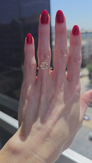 Image & Videos depicting a 3.70ct Pinkish-Brown VS2 Cushion Lab Grown Diamond center stone, finger size 5