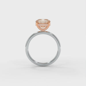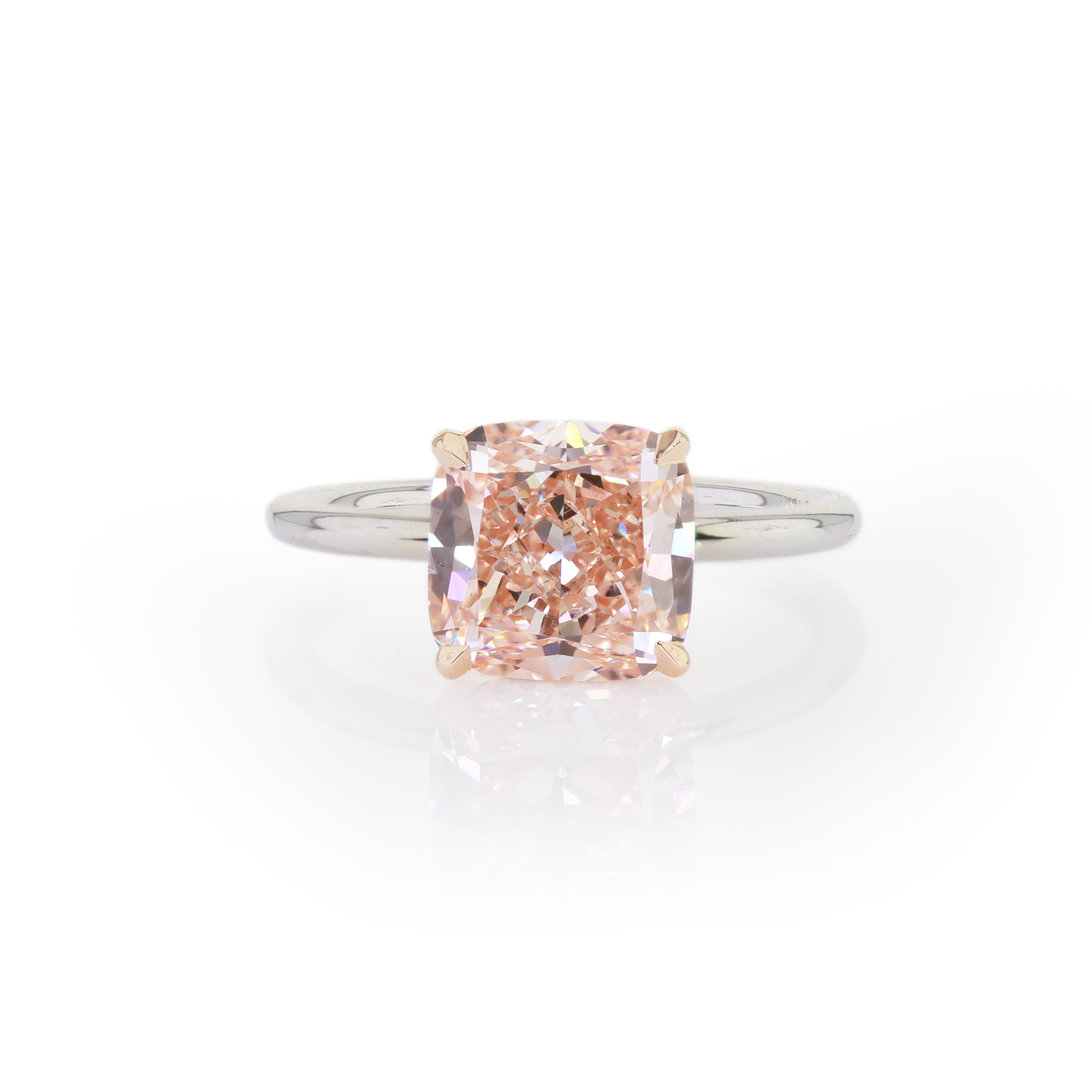 This Taylor Solitaire features a 3.70ct Pinkish-Brown VS2 Cushion Lab Grown Diamond center stone, lab grown diamond accents and is set in a 18K Rose Gold head and 18K White Gold Shank.