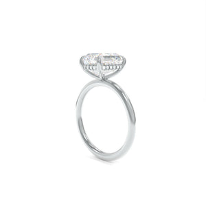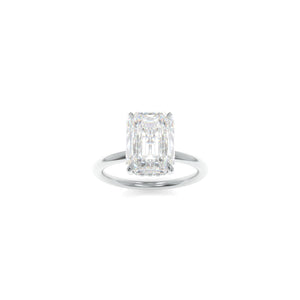 The Taylor Solitaire is crafted a 9x7mm Emerald TrueGem moissanite and features round lab grown diamond accents. This ring is available in 18k white gold.