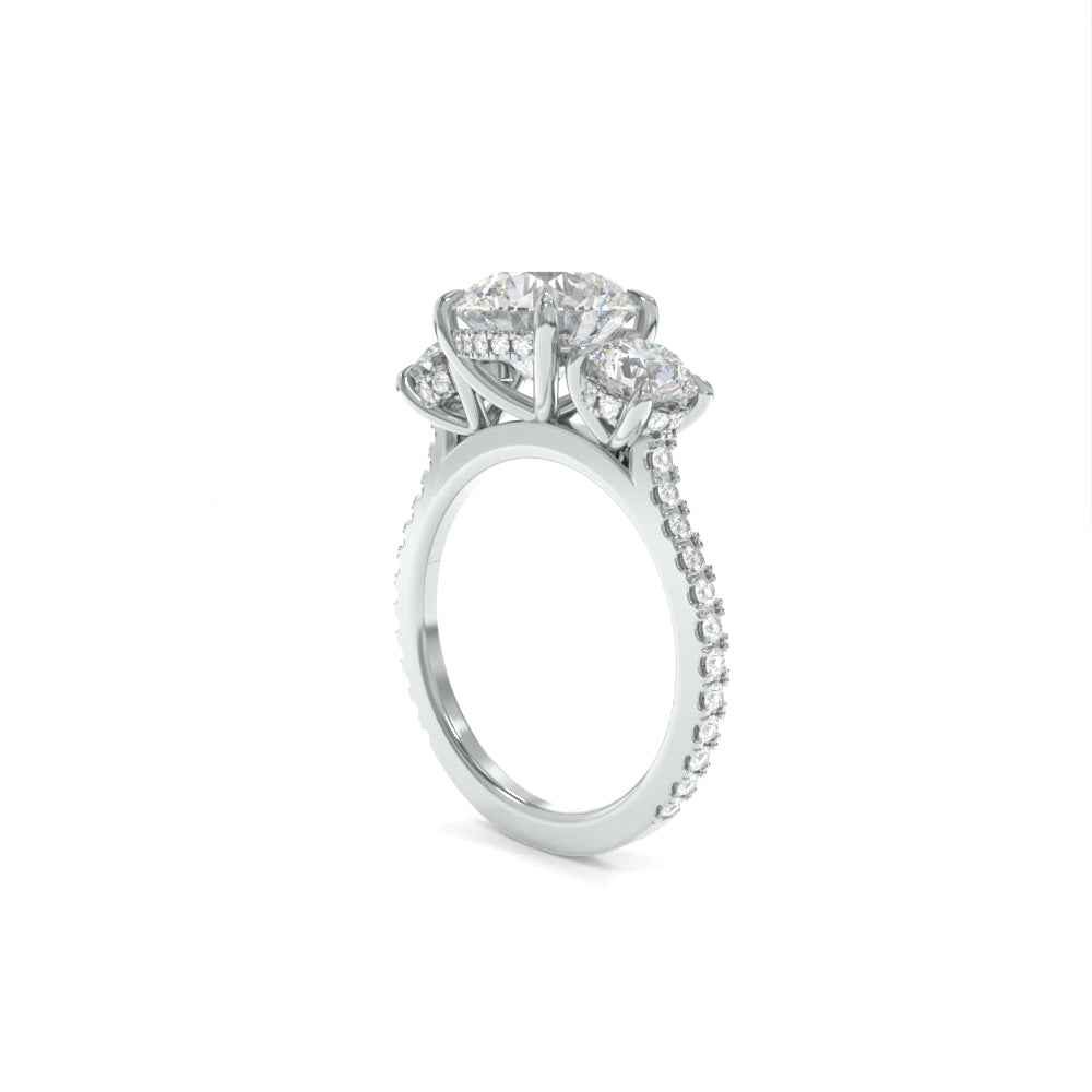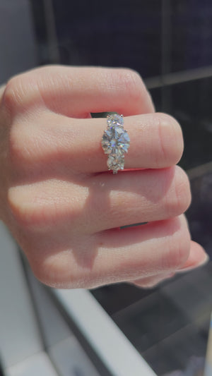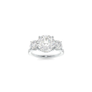Render depicting with a 8.5mm Round TrueGem Moissanite center stone with 5mm Round TrueGem Moissanite side stones. Video depicting an 8mm Round H&A TrueGem Moissanite center stone, 5mm Round H&A TrueGem Moissanite side stones, finger size 5.